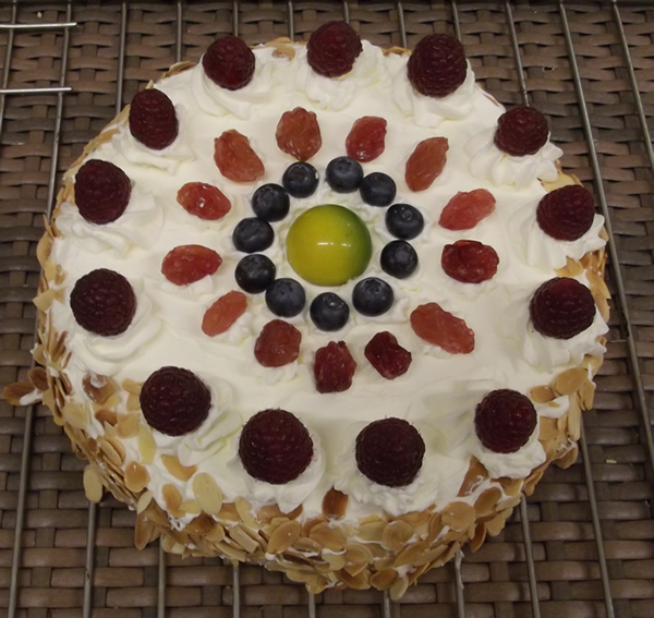Amandes éffilées avec décor de framboises , d’abricots secs imbibés de grand Marnier