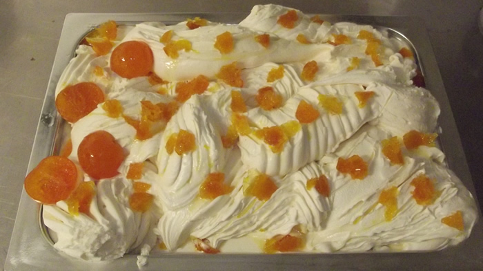 Caramel, praliné, fruits macérés à l'alcool, fruits confits hachés ou en purée, nougatine,