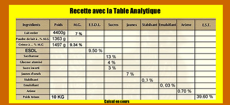 • Les pourcentages de matière grasse totale, d'E.S.D.L., d'extrait sec total d'un mix.