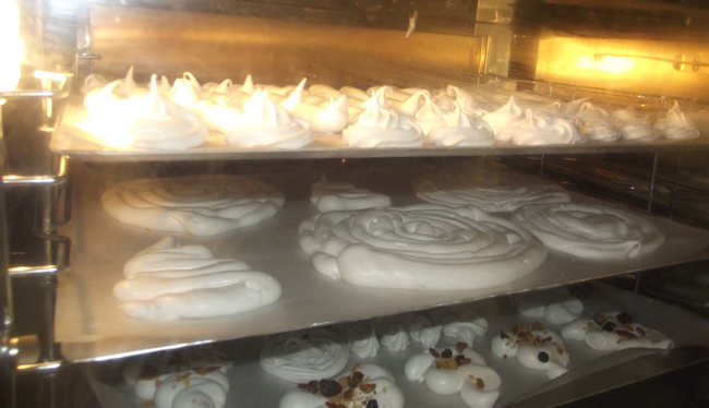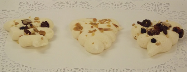 Biscuit croquant noix de cajou & génoise à la crème de cassis & Merigues.