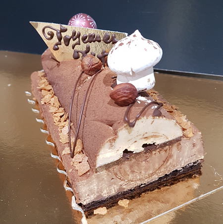 Buche glacée , croquant chocolat noisette, glace chocolat blanc & Nougat
